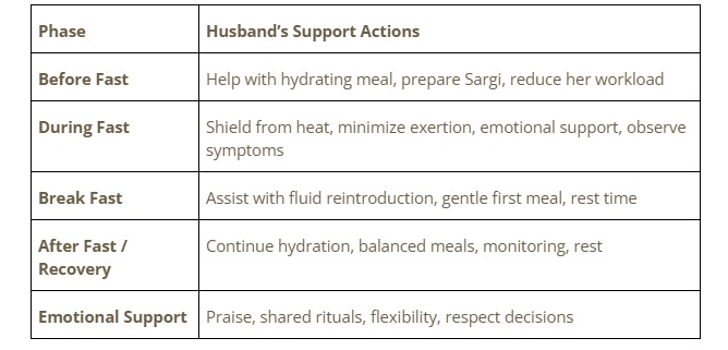By helping with preparation, safeguarding her during the fast, enabling a safe break, monitoring health, and sustaining emotional closeness, a husband fulfills the role of both partner and protector.