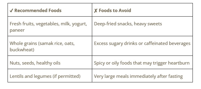 - Pre-fast meal: Combine complex carbohydrates (oats, whole grains), proteins (dairy, lentils), and healthy fats (nuts, seeds).